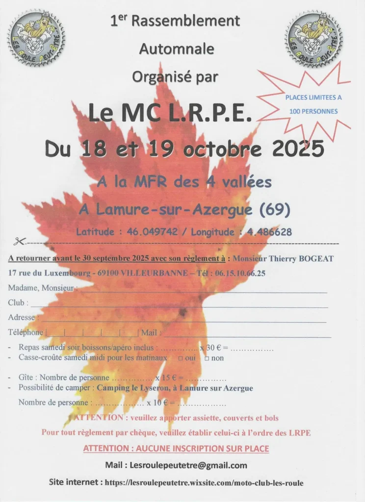 Il motoraduno avrà luogo a Lamure-sur-Azergue (Francia), presso la MFR des 4 vallées. Sarà un’ottima occasione per ritrovarsi in compagnia prima della pausa invernale.