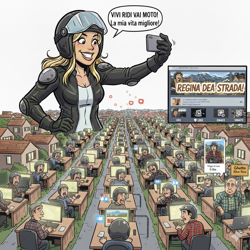 Il motivo è semplice: la centralità per alcune non è più la moto, non è il viaggio, non è il paesaggio e non è la storia. La centralità è Lei. La strada diventa un set, il panorama un filtro sfuocato e la motocicletta un semplice accessorio di scena, utile solo a giustificare la propria presenza online. Quando l’obiettivo non inquadra più la libertà del movimento ma si sposta ossessivamente sul soggetto, la passione diventa un pretesto.